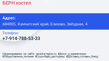 БЕРН, хостел по адресу 684005, Камчатский край, Елизово, Звёздная, 4 в дальнейшем Организация, размещена в следующих категориях: