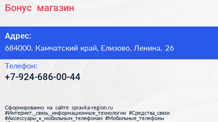 Бонус+, магазин по адресу 684000, Камчатский край, Елизово, Ленина, 26 в дальнейшем Организация, размещена в следующих категориях: