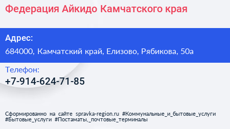 Федерация Айкидо Камчатского края по адресу 684000, Камчатский край, Елизово, Рябикова, 50а в дальнейшем Организация, размещена в следующих категориях: