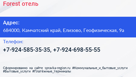Forest, отель по адресу 684000, Камчатский край, Елизово, Геофизическая, 9а в дальнейшем Организация, размещена в следующих категориях: