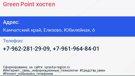 Green Point, хостел по адресу Камчатский край, Елизово, Юбилейная, 6 в дальнейшем Организация, размещена в следующих категориях: