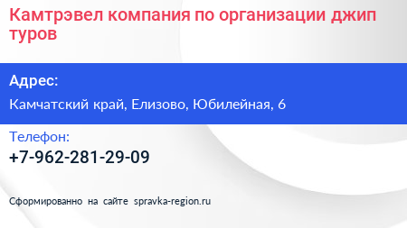 Камтрэвел, компания по организации джип-туров по адресу Камчатский край, Елизово, Юбилейная, 6 в дальнейшем Организация, размещена в следующих категориях: