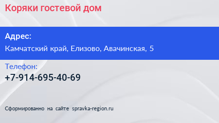 Расстояние от центра города до организации по самому короткому пути 22.9 км., объявление находиться в справочнике Елизово (Камчатский край), т.к осуществляет деятельность в этом городе.