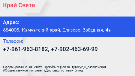 Край Света по адресу 684005, Камчатский край, Елизово, Звёздная, 4а в дальнейшем Организация, размещена в следующих категориях: