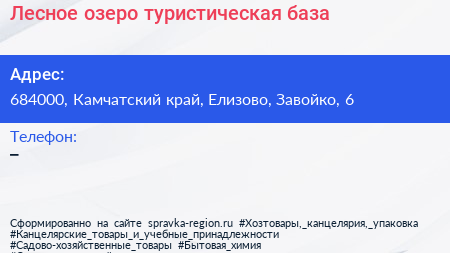 Лесное озеро, туристическая база по адресу 684000, Камчатский край, Елизово, Завойко, 6 в дальнейшем Организация, размещена в следующих категориях: