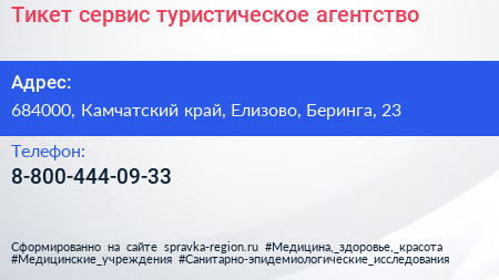 Тикет сервис, туристическое агентство по адресу 684000, Камчатский край, Елизово, Беринга, 23 в дальнейшем Организация, размещена в следующих категориях: