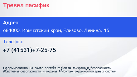 Тревел пасифик по адресу 684000, Камчатский край, Елизово, Ленина, 15 в дальнейшем Организация, размещена в следующих категориях: