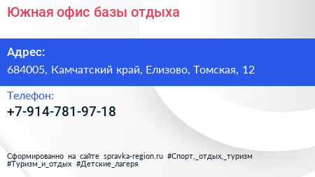 Южная, офис базы отдыха по адресу 684005, Камчатский край, Елизово, Томская, 12 в дальнейшем Организация, размещена в следующих категориях: