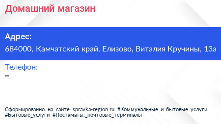 Домашний, магазин по адресу 684000, Камчатский край, Елизово, Виталия Кручины, 13а в дальнейшем Организация, размещена в следующих категориях:
