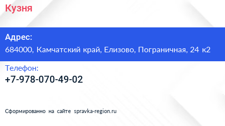 Кузня по адресу 684000, Камчатский край, Елизово, Пограничная, 24 к2 в дальнейшем Организация, размещена в следующих категориях: