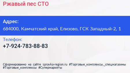 Ржавый пес, СТО по адресу 684000, Камчатский край, Елизово, ГСК Западный-2, 1 в дальнейшем Организация, размещена в следующих категориях: