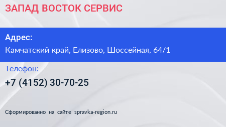 ЗАПАД-ВОСТОК СЕРВИС по адресу Камчатский край, Елизово, Шоссейная, 64/1 в дальнейшем Организация, размещена в следующих категориях: