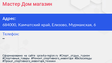 Мастер Дом, магазин по адресу 684000, Камчатский край, Елизово, Мурманская, 6 в дальнейшем Организация, размещена в следующих категориях: