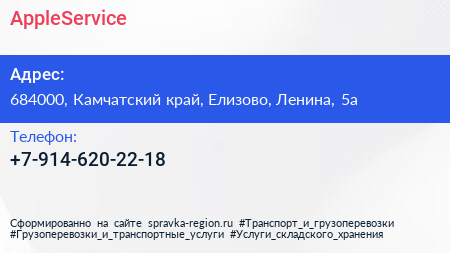 AppleService по адресу 684000, Камчатский край, Елизово, Ленина, 5а в дальнейшем Организация, размещена в следующих категориях: