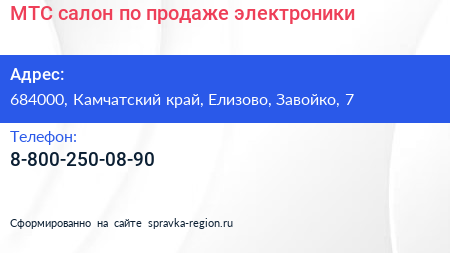 МТС, салон по продаже электроники по адресу 684000, Камчатский край, Елизово, Завойко, 7 в дальнейшем Организация, размещена в следующих категориях: