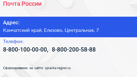 Почта России по адресу Камчатский край, Елизово, Центральная, 7 в дальнейшем Организация, размещена в следующих категориях: