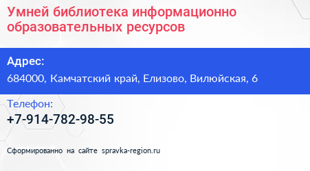 Умней, библиотека информационно-образовательных ресурсов по адресу 684000, Камчатский край, Елизово, Вилюйская, 6 в дальнейшем Организация, размещена в следующих категориях: