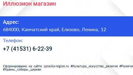 Иллюзион, магазин по адресу 684000, Камчатский край, Елизово, Ленина, 12 в дальнейшем Организация, размещена в следующих категориях: