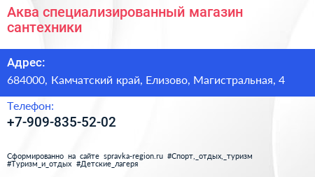 Аква, специализированный магазин сантехники по адресу 684000, Камчатский край, Елизово, Магистральная, 4 в дальнейшем Организация, размещена в следующих категориях: