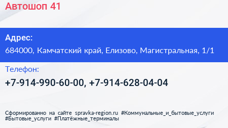Автошоп. 41 по адресу 684000, Камчатский край, Елизово, Магистральная, 1/1 в дальнейшем Организация, размещена в следующих категориях: