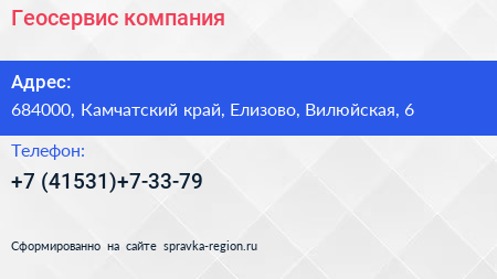 Геосервис, компания по адресу 684000, Камчатский край, Елизово, Вилюйская, 6 в дальнейшем Организация, размещена в следующих категориях: