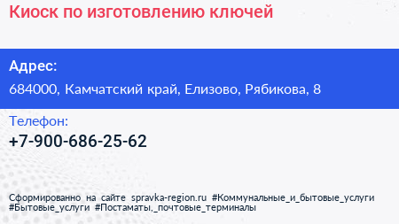 Киоск по изготовлению ключей по адресу 684000, Камчатский край, Елизово, Рябикова, 8 в дальнейшем Организация, размещена в следующих категориях: