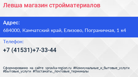Левша, магазин стройматериалов по адресу 684000, Камчатский край, Елизово, Пограничная, 1 к4 в дальнейшем Организация, размещена в следующих категориях: