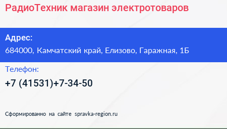 РадиоТехник, магазин электротоваров по адресу 684000, Камчатский край, Елизово, Гаражная, 1Б в дальнейшем Организация, размещена в следующих категориях: