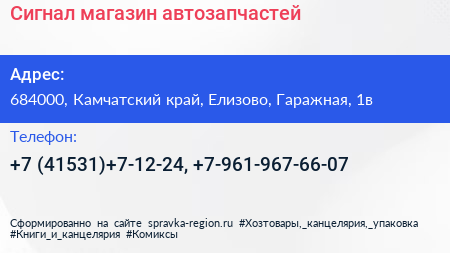 Сигнал, магазин автозапчастей по адресу 684000, Камчатский край, Елизово, Гаражная, 1в в дальнейшем Организация, размещена в следующих категориях: