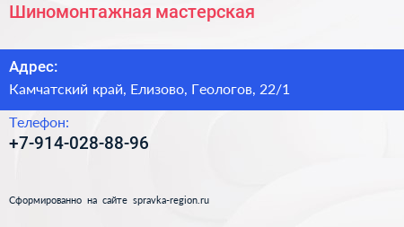 Шиномонтажная мастерская по адресу Камчатский край, Елизово, Геологов, 22/1 в дальнейшем Организация, размещена в следующих категориях: