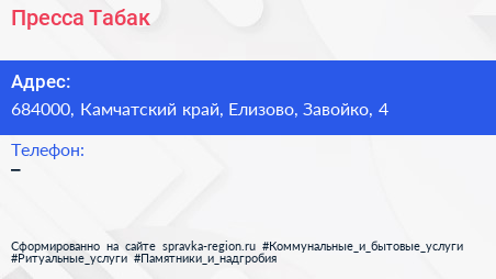 Пресса-Табак по адресу 684000, Камчатский край, Елизово, Завойко, 4 в дальнейшем Организация, размещена в следующих категориях: