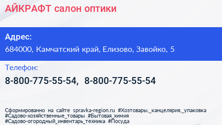 АЙКРАФТ, салон оптики по адресу 684000, Камчатский край, Елизово, Завойко, 5 в дальнейшем Организация, размещена в следующих категориях: