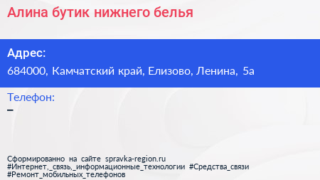 Алина, бутик нижнего белья по адресу 684000, Камчатский край, Елизово, Ленина, 5а в дальнейшем Организация, размещена в следующих категориях: