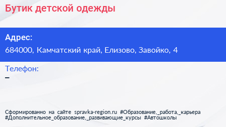 Бутик детской одежды по адресу 684000, Камчатский край, Елизово, Завойко, 4 в дальнейшем Организация, размещена в следующих категориях: