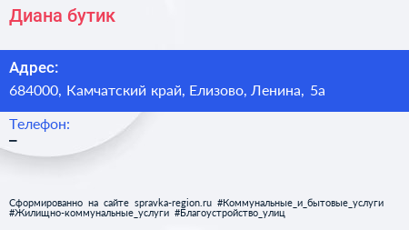 Диана, бутик по адресу 684000, Камчатский край, Елизово, Ленина, 5а в дальнейшем Организация, размещена в следующих категориях: