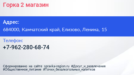 Горка 2, магазин по адресу 684000, Камчатский край, Елизово, Ленина, 15 в дальнейшем Организация, размещена в следующих категориях: