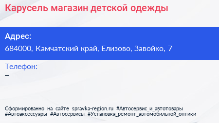 Карусель, магазин детской одежды по адресу 684000, Камчатский край, Елизово, Завойко, 7 в дальнейшем Организация, размещена в следующих категориях: