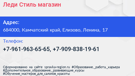 Леди Стиль, магазин по адресу 684000, Камчатский край, Елизово, Ленина, 17 в дальнейшем Организация, размещена в следующих категориях: