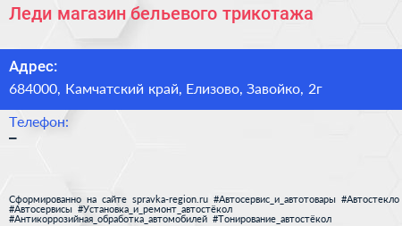 Леди, магазин бельевого трикотажа по адресу 684000, Камчатский край, Елизово, Завойко, 2г в дальнейшем Организация, размещена в следующих категориях: