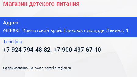 Магазин детского питания по адресу 684000, Камчатский край, Елизово, площадь Ленина, 1 в дальнейшем Организация, размещена в следующих категориях:
