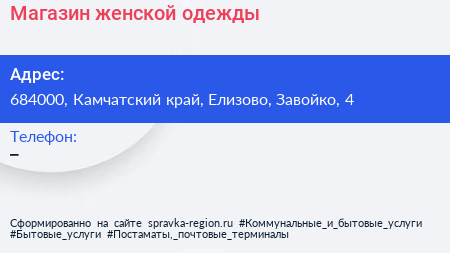 Магазин женской одежды по адресу 684000, Камчатский край, Елизово, Завойко, 4 в дальнейшем Организация, размещена в следующих категориях: