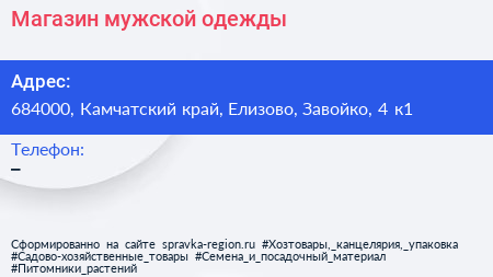 Магазин мужской одежды по адресу 684000, Камчатский край, Елизово, Завойко, 4 к1 в дальнейшем Организация, размещена в следующих категориях: