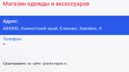 Магазин одежды и аксессуаров по адресу 684000, Камчатский край, Елизово, Завойко, 4 в дальнейшем Организация, размещена в следующих категориях:
