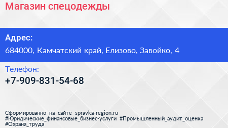 Магазин спецодежды по адресу 684000, Камчатский край, Елизово, Завойко, 4 в дальнейшем Организация, размещена в следующих категориях: