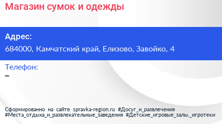 Магазин сумок и одежды по адресу 684000, Камчатский край, Елизово, Завойко, 4 в дальнейшем Организация, размещена в следующих категориях: