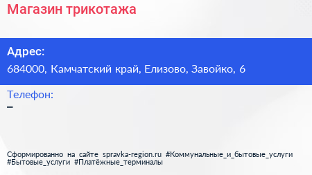 Магазин трикотажа по адресу 684000, Камчатский край, Елизово, Завойко, 6 в дальнейшем Организация, размещена в следующих категориях: