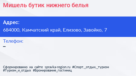 Мишель, бутик нижнего белья по адресу 684000, Камчатский край, Елизово, Завойко, 7 в дальнейшем Организация, размещена в следующих категориях: