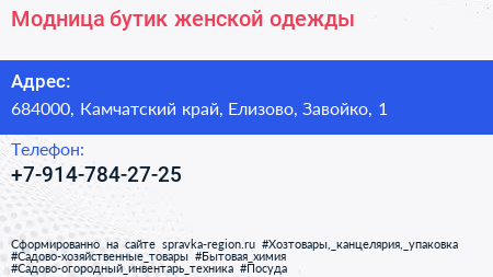 Модница, бутик женской одежды по адресу 684000, Камчатский край, Елизово, Завойко, 1 в дальнейшем Организация, размещена в следующих категориях: