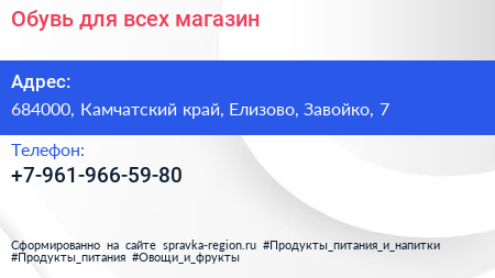 Обувь для всех, магазин по адресу 684000, Камчатский край, Елизово, Завойко, 7 в дальнейшем Организация, размещена в следующих категориях: