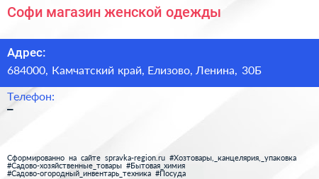 Софи, магазин женской одежды по адресу 684000, Камчатский край, Елизово, Ленина, 30Б в дальнейшем Организация, размещена в следующих категориях: